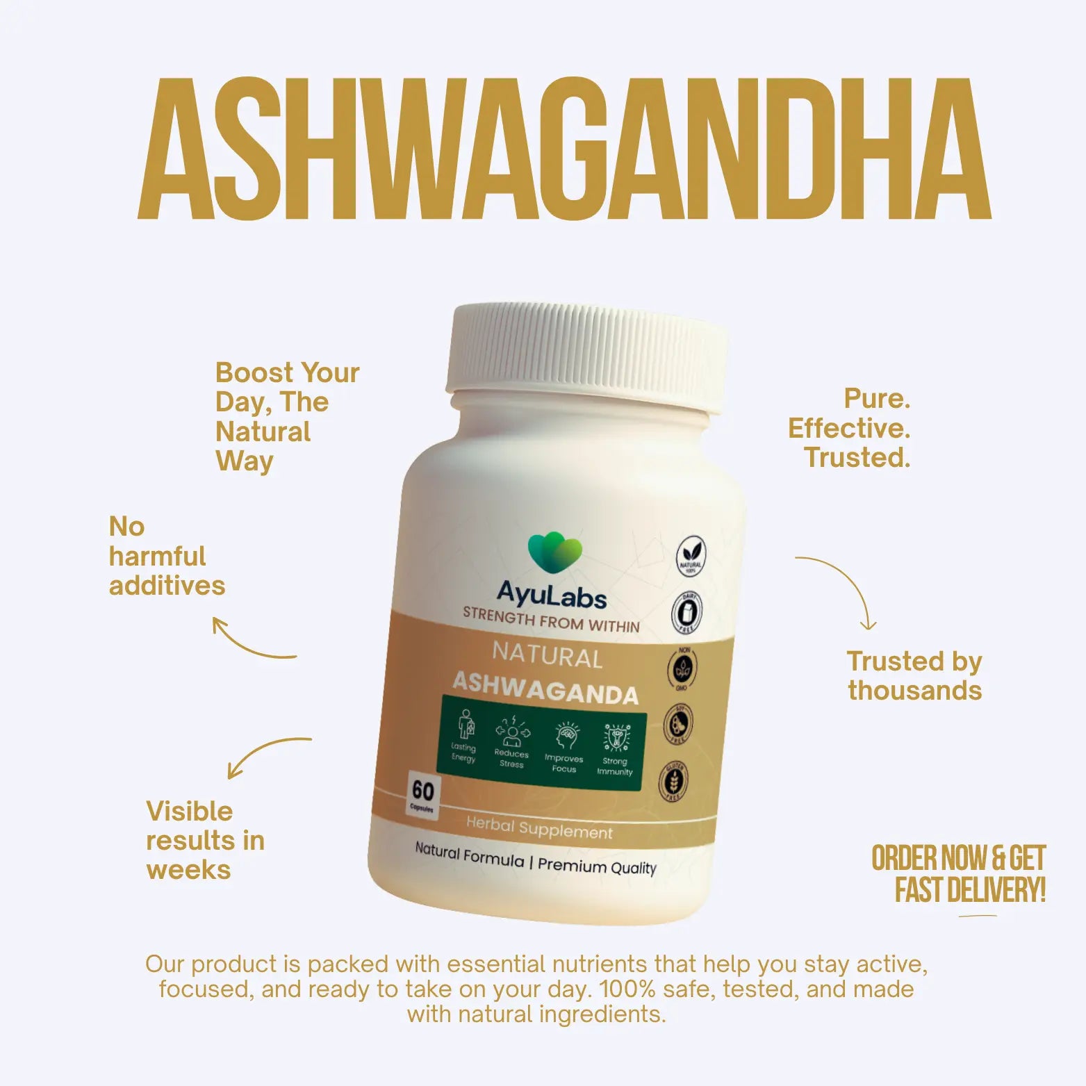 Discover daily balance and amplified passion with AyuLabs Ashwagandha Capsules, made from a pure, potent root extract.